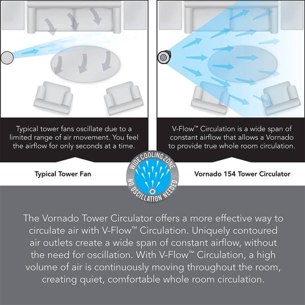 The Vornado Tower Circulator offers a more effective way to circulate air with V-Flow Circulation. Uniquely contoured air outlets create a wide span of constant airflow, without the need for oscillation. With V-Flow Circulation, a high volume of air is continuously moving throughout the room, creating quiet, comfortable whole room circulation.